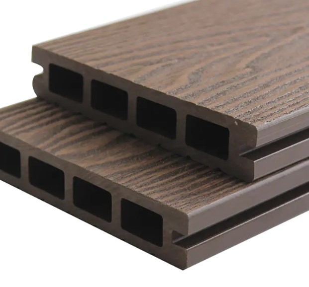 Lantai WPC berongga memiliki terowongan lubang bundar atau persegi di dalam penampang. Struktur ini membuatnya ringan dalam berat, biaya rendah, dan memiliki kekuatan lentur tinggi. Namun, mudah untuk berkembang karena akumulasi air internal selama pemasangan, dan ujungnya perlu disegel atau lubang drainase perlu ditambahkan. Permukaannya tipis dan rentan terhadap retak karena keausan jangka panjang. Lantai WPC berongga sering digunakan di ruang seperti halaman rumah dan teras.